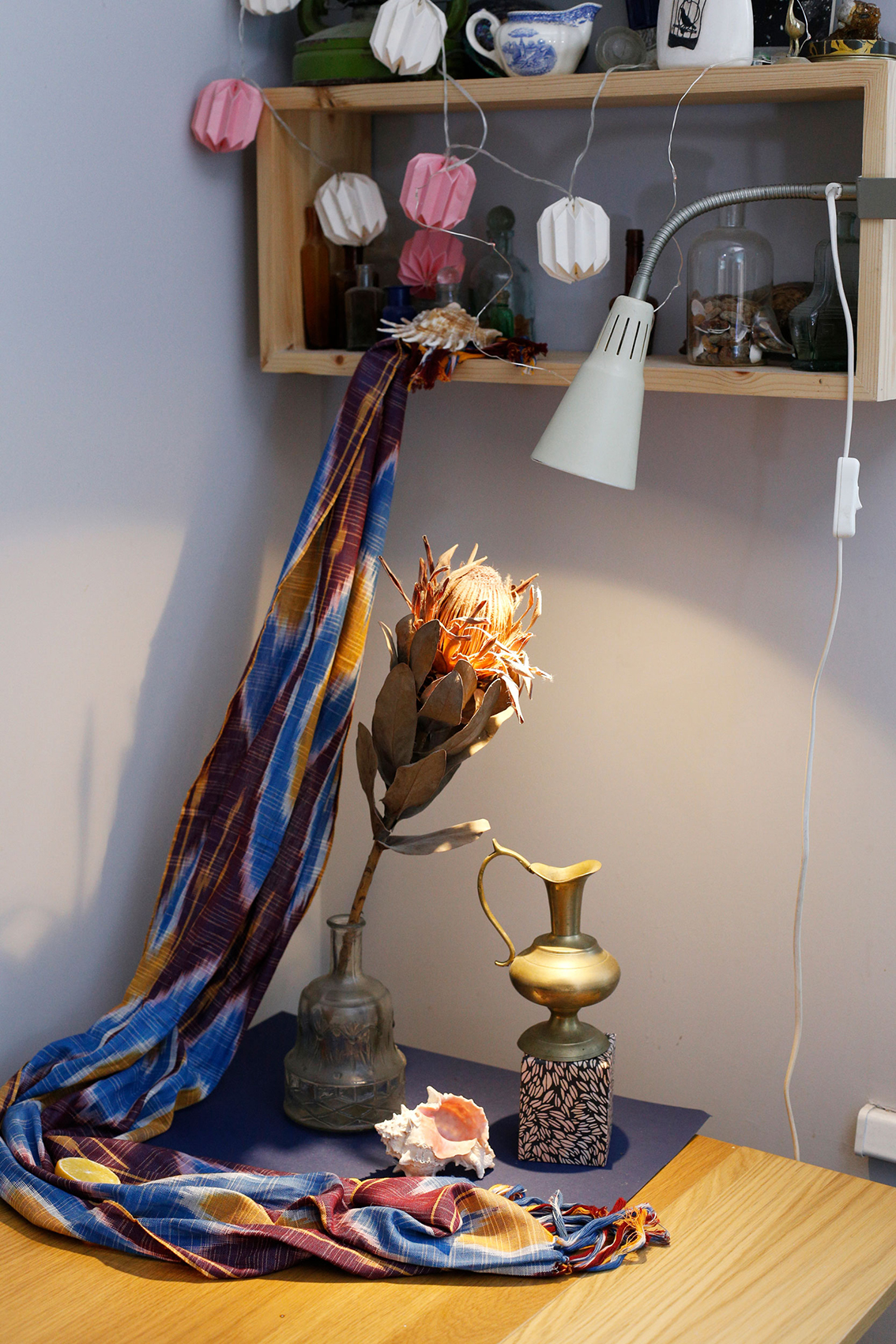 с помощью малярной ленты (скотча) в виде фона, или положить на столе. В виде драпировки мы использовали шарф с ярким восточным узором.