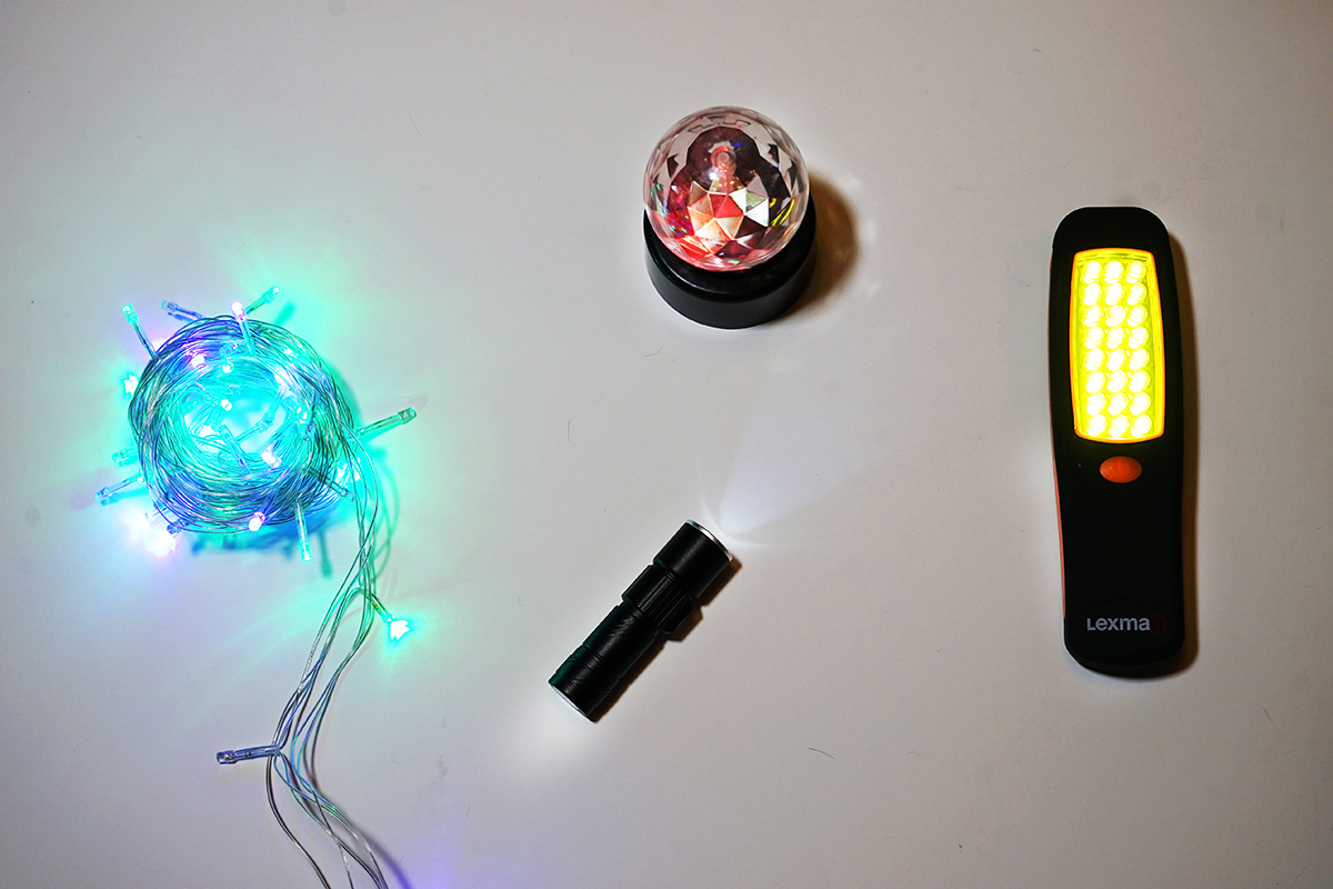Чтобы сделать цветной фонарик из белого, можно использовать цветной скотч! Или закрасить кусочек прозрачного скотча цветным маркером, а затем наклеить его на фонарик. Чем больше разнообразных источников света в кадре, тем интереснее!